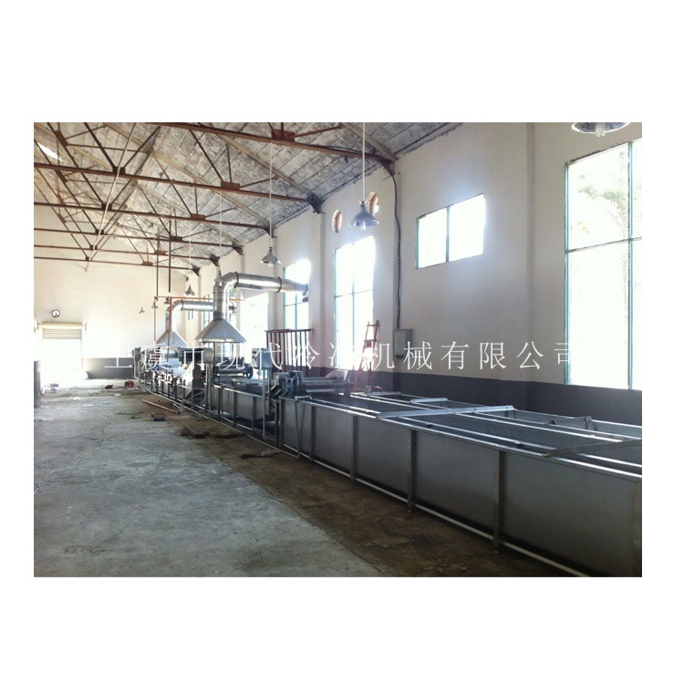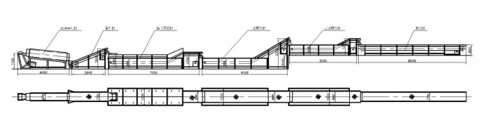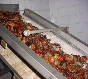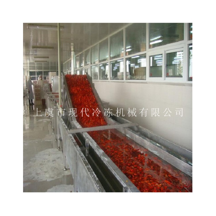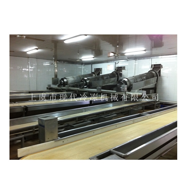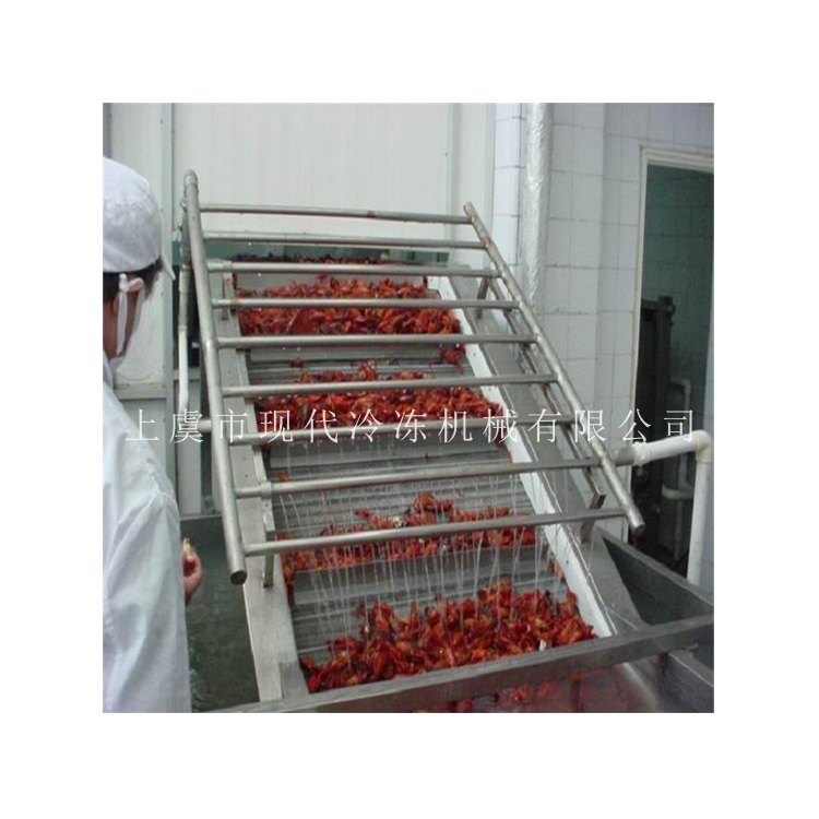 本套前處理生產(chǎn)線共分為六個部分:提升機+滾動分級機+箱式漂燙機 +常溫水預(yù)冷機+冰水預(yù)冷機+隧道速凍設(shè)備/液氮速凍設(shè)備;可以速凍整蝦